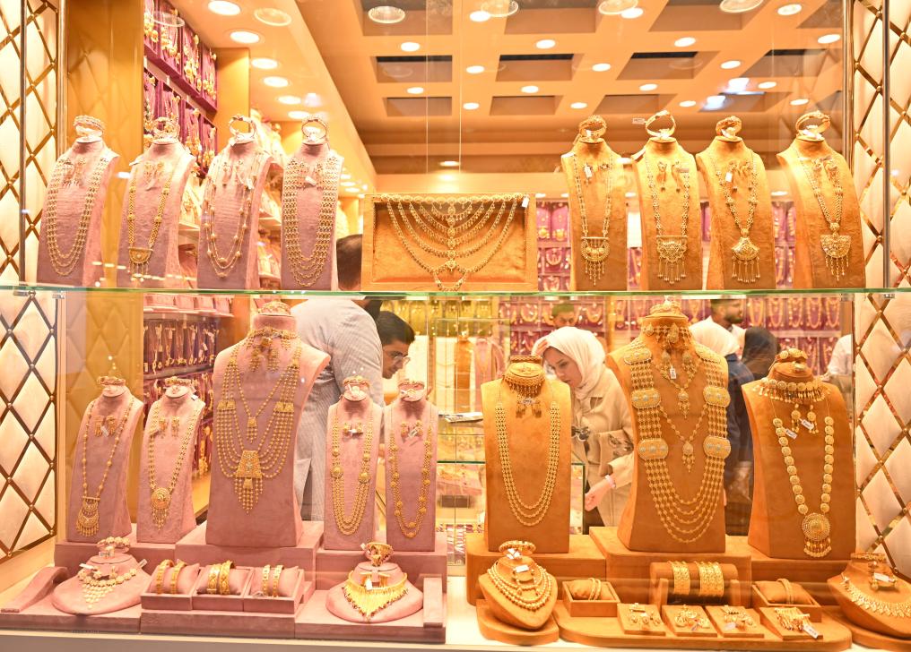 10月7日,在科威特哈瓦利省,一名男子在珠寶展上展示飾品。