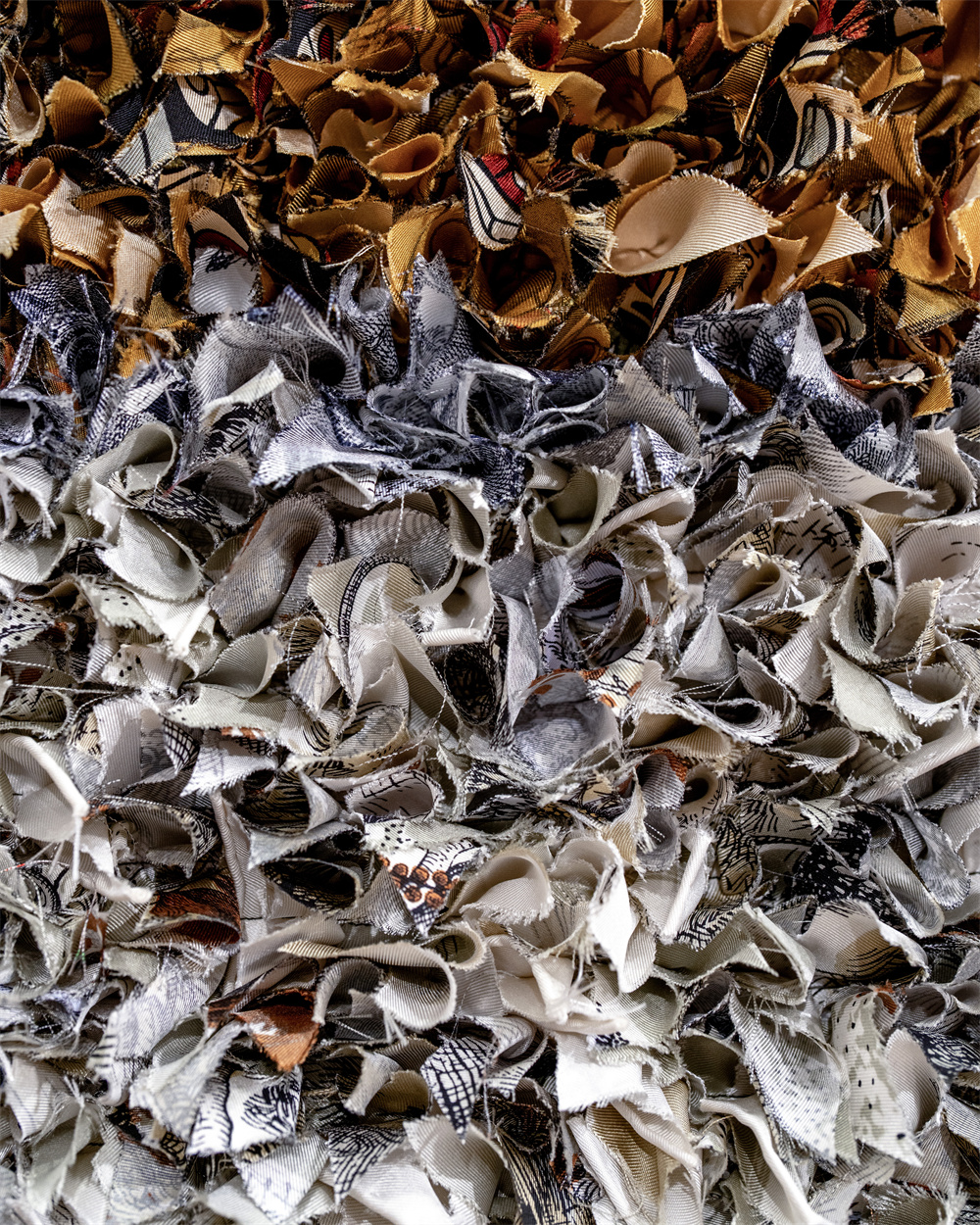 在極具現代感的迪奧展區內,四周墻面上展陳著藝術家喬爾?安德里亞諾馬里索亞創作的大型裝置藝術品“LES SAISONS IMAGINAIRES”(二零二一年)。該作品取自品牌往季的真絲絲巾,裝裱于多塊展板之上,構筑出層疊而富有詩意的視覺景觀。