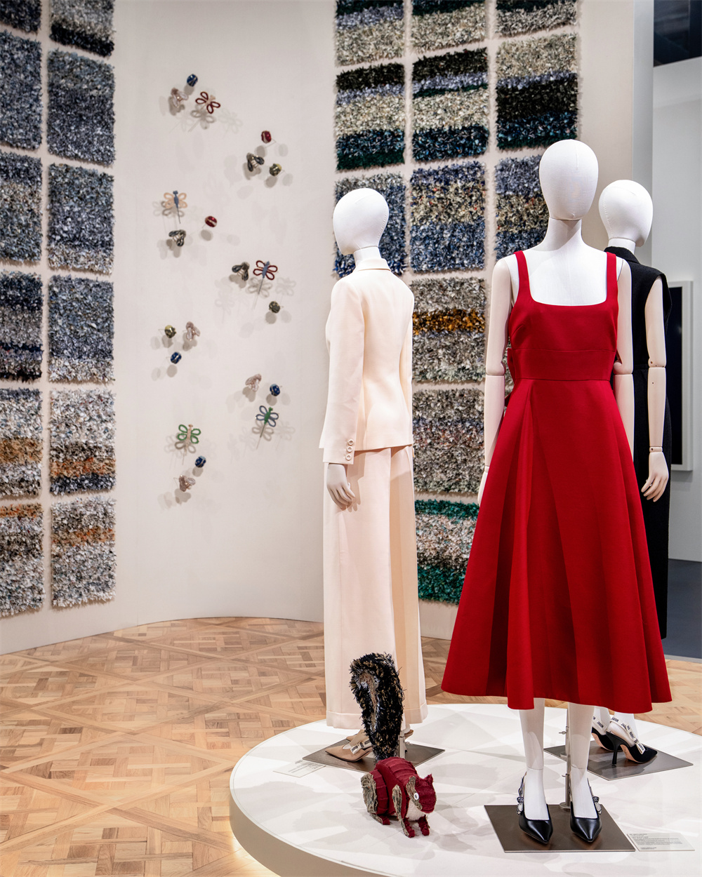 在展區中央,迪奧帶來了多款以可持續理念設計的產品,涵蓋男裝與女裝成衣系列。這些作品選用經認證的可持續面料,遵循嚴格的環境與社會標準,從原料、工藝到制作流程皆力求降低對生態的影響。