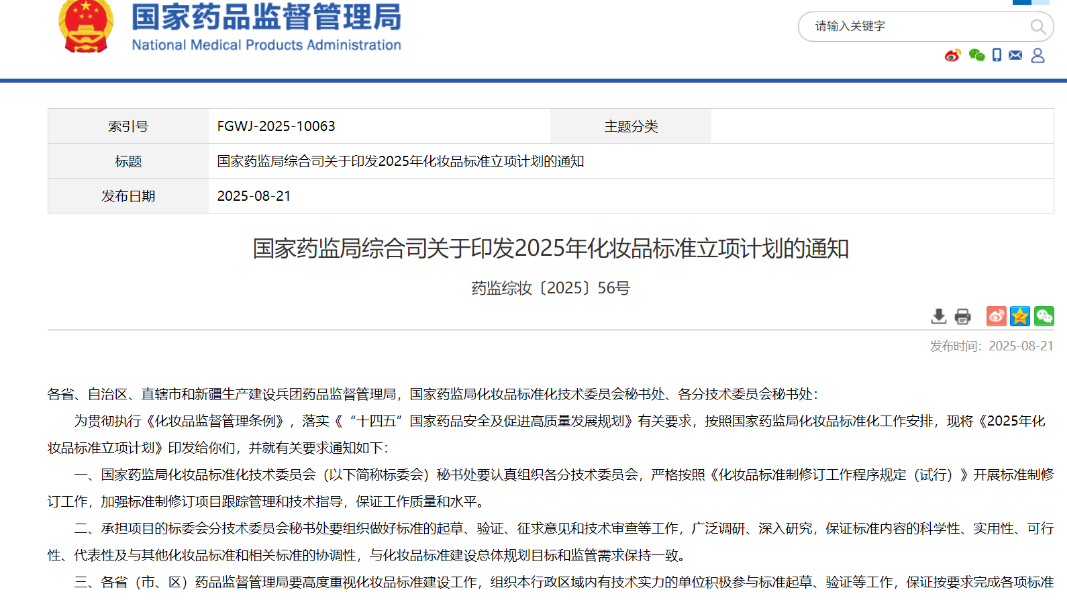 國家藥監局綜合司關于印發2025年化妝品標準立項計劃的通知