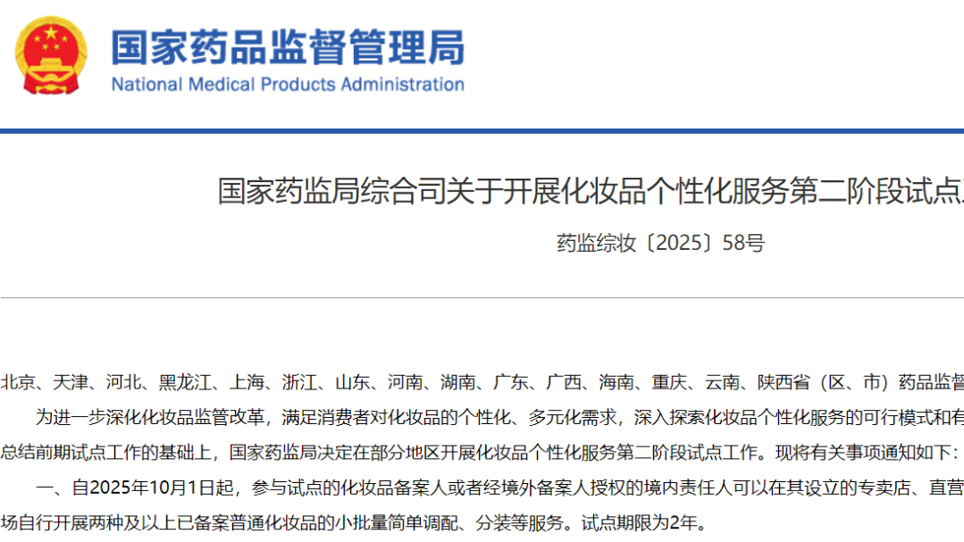 國家藥監局綜合司關于開展化妝品個性化服務第二階段試點工作的通知 藥監綜妝〔2025〕58號