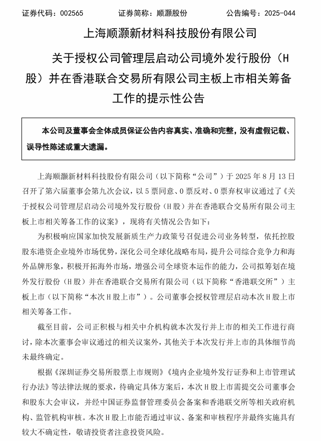 8月14日,上海順灝新材料科技股份有限公司(以下簡稱“順灝股份”)發布公告稱,公司擬籌劃境外發行股份(H股)并在香港聯交所主板上市,以積極響應國家加快發展新質生產力政策號召,促進公司業務轉型,深化全球化戰略布局。