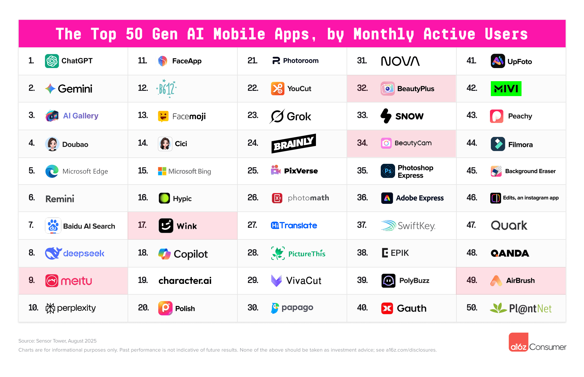 在移動應用Top50榜單中,來自中國企業的產品在前10名中拿到4個席位,分別是第4名豆包、第7名百度AI,第8名DeepSeek,第9名美圖秀秀。