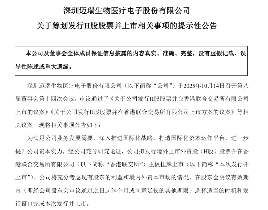 10月14日晚間,邁瑞醫療公告,為滿足公司業務發展需要,深入推進國際化戰略,打造國際化資本運作平臺,進一步提升公司資本實力,經公司充分研究論證,公司擬發行境外上市外資股(H股)股票并在香港聯交所主板掛牌上市。
