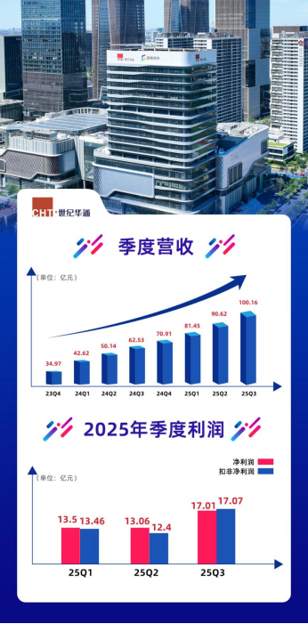 世紀華通(002602.sz)實現營收100.16億元,同比增長60.19%;凈利潤17.01億元,同比增長163.78%;扣非后凈利潤17.07億元,同比增長171.27%——上述成績單來自10月30日公司披露的2025第三季度報告。至此,世紀華通不僅達成了季度營收“十連升”,單季度營收更是第一次突破百億規模,展示出可持續的強勁增長態勢。