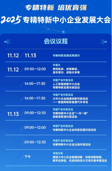 2025年專精特新中小企業發展大會以“專精特新 培優育強”為主題,將于11月11日至13日在重慶市舉辦。大會將舉辦1場開幕式、1場發展成果展示、5場專題產業對接活動,以及4場特色產業考察活動。