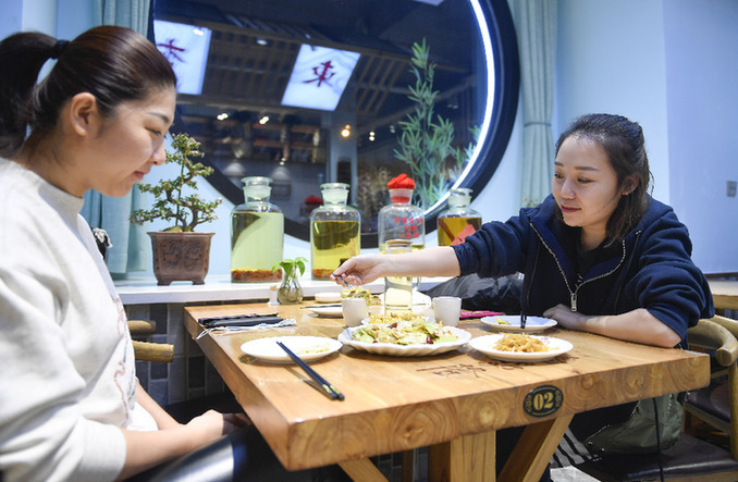 在四川省彭州市一家菜館,食客使用公筷為朋友夾菜。新華社 羅國楊 攝