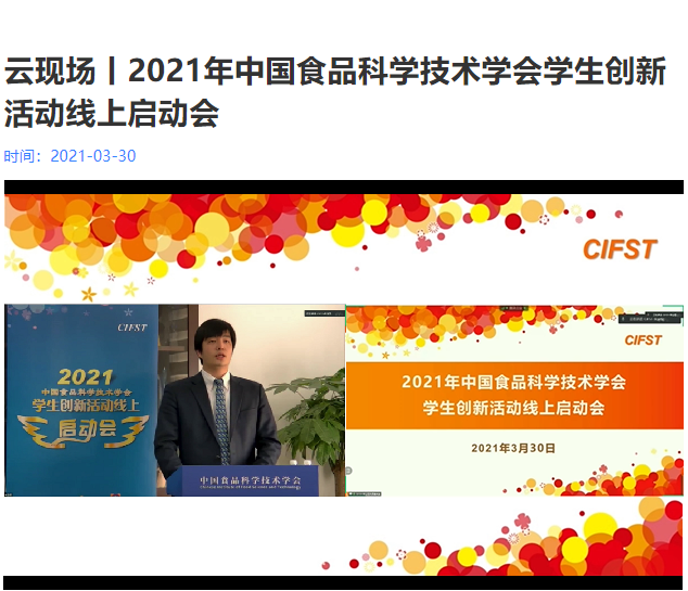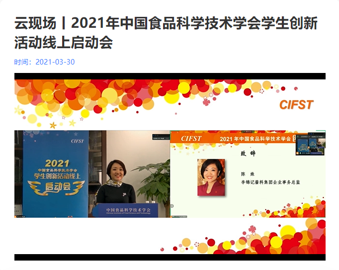 3月30日,2021中國食品科學技術學會學生創新活動啟動會以直播方式舉辦,包括李錦記杯學生創新大賽在內共六項大賽,共同于線上啟動。食品科技界專家、企業代表與近兩萬名高校師生齊聚云端,針對食品工業的前沿發展趨勢、高校產學研一體化及培養大學生創新與創業精神等主題進行了交流和探討。與此同時,去年各項大賽的獲獎隊伍代表受邀進行了經驗分享,他們對于創新探索的理解和實踐參與的體會,不僅提供了寶貴的實戰指引,更激發了在線同學們的參賽熱情,引發了熱烈的提問與討論。