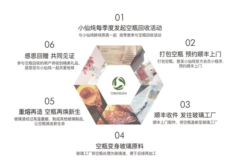 中式滋補講究長期堅持更有效,小仙燉鼓勵用戶堅持長期規律滋補。大量用戶通過購買月套餐、年套餐進行定時長期的規律滋補,因此也產生了大量空瓶。為踐行可持續發展理念,小仙燉自2019年起發起空瓶回收公益活動,按季度發起,從用戶手中回收燕窩空瓶,發往玻璃工廠處理為玻璃渣,經過高溫重熔,再造為玻璃制品,讓廢舊玻璃煥發新生。