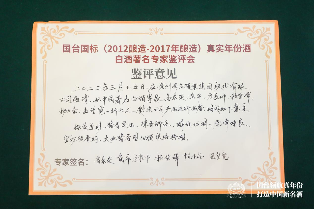 貴州省釀酒工業協會理事長黃平代表品評專家團現場宣讀了國臺國標(2017年釀造)的品評鑒定結果:微黃透明、醬香突出、陳香舒適、醇潤協調、尾凈味長、空杯留香、大曲醬香型白酒風格典型。