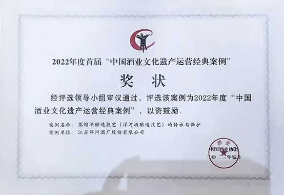 洋河股份“蒸餾酒釀造技藝(洋河酒釀造技藝)的傳承與保護”,榮獲“中國酒業文化遺產運營經典案例”;