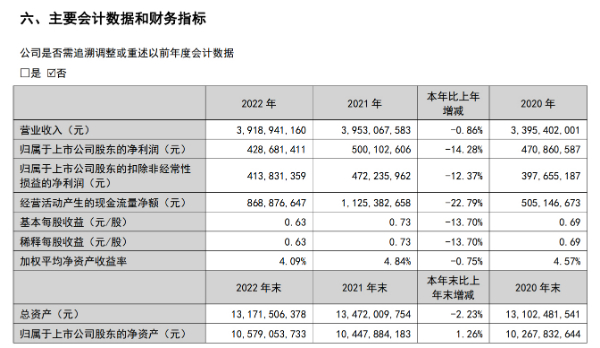 新華網北京4月13日電(記者 胡可璐)4月12日晚間,張裕A(以下簡稱張裕)發布2022年年度報告。年報顯示,2022年張裕實現營業收入39.19億元,同比微降0.86%;實現凈利潤4.29億元,同比下降14.28%。