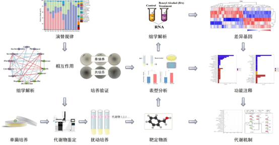 該論文的研究內容包括如下方面:(1)采用擴增子測序技術揭示了該過程中微生物群落組成及演替規律,進而結合統計學分析明確了原位體系中功能微生物之間的相互作用;(2)以原位體系分離純化的功能微生物為對象,采用雙碟法結合非接觸培養模式,驗證了各微生物成員間的相互作用;(3)在單菌培養模式下鑒定供體微生物產生的主要揮發性有機化合物,再依次擾動受體微生物的生長,進而基于受體微生物的生長情況確定具有顯著影響的化合物;(4)采用轉錄組學技術比較分析了在化合物擾動與非擾動模式下受體微生物的代謝差異,以關鍵化合物在微生物細胞間的感應與通訊機制。上述研究表明:微生物釋放豐度的揮發性有機化合物,在微生物種內或種間的遠程互動或交流中扮演重要角色;這些物質通過細胞壁或細胞膜擴散,影響微生物細胞生長或代謝,以促進成員間的協同生長(圖2)。該研究也提供了一種潛在策略,通過調節體系內揮發性有機化合物以干預制曲過程中功能微生物的生長或代謝,有待深入研究。