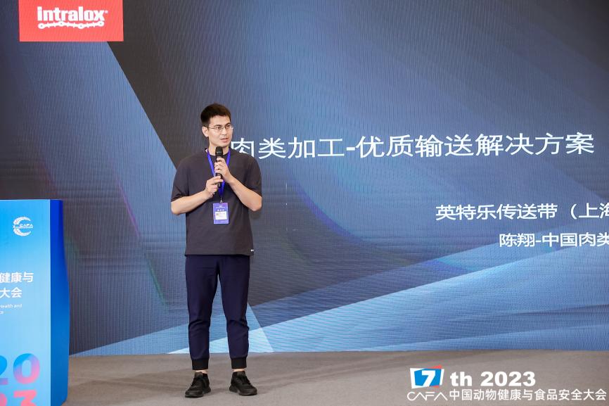 英特樂傳送帶(上海)有限公司肉類行業經理陳翔分享了食品加工中的優質輸送案例,他首先以綠皮車與動車的運輸區別為切入點,提出食品安全是一綜合性問題,食品行業的運輸尤為重要。他介紹多個食品加工中產品運輸損失規避案例,指出好的輸送方案應該具備保障轉運過程中的食品安全、減少運輸過程中的產品損失、優秀的清潔衛生設計等特征。