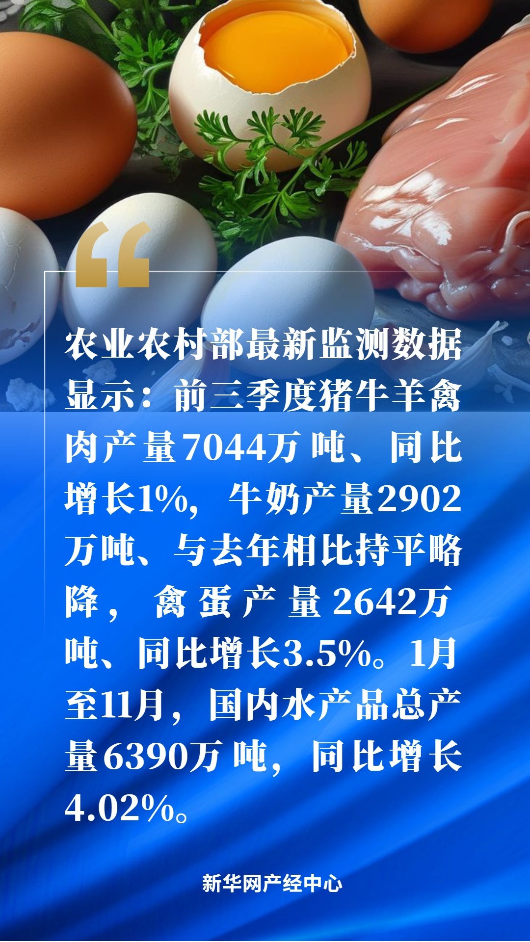 農業農村部監測數據顯示,生豬產能有序調控,2024年11月末全國能繁母豬存欄量4080萬頭,生豬養殖業穩步發展。前三季度豬牛羊禽肉產量7044萬噸、同比增長1%,牛奶產量2902萬噸、與去年相比持平略降,禽蛋產量2642萬噸、同比增長3.5%。1月至11月,國內水產品總產量6390萬噸,同比增長4.02%。