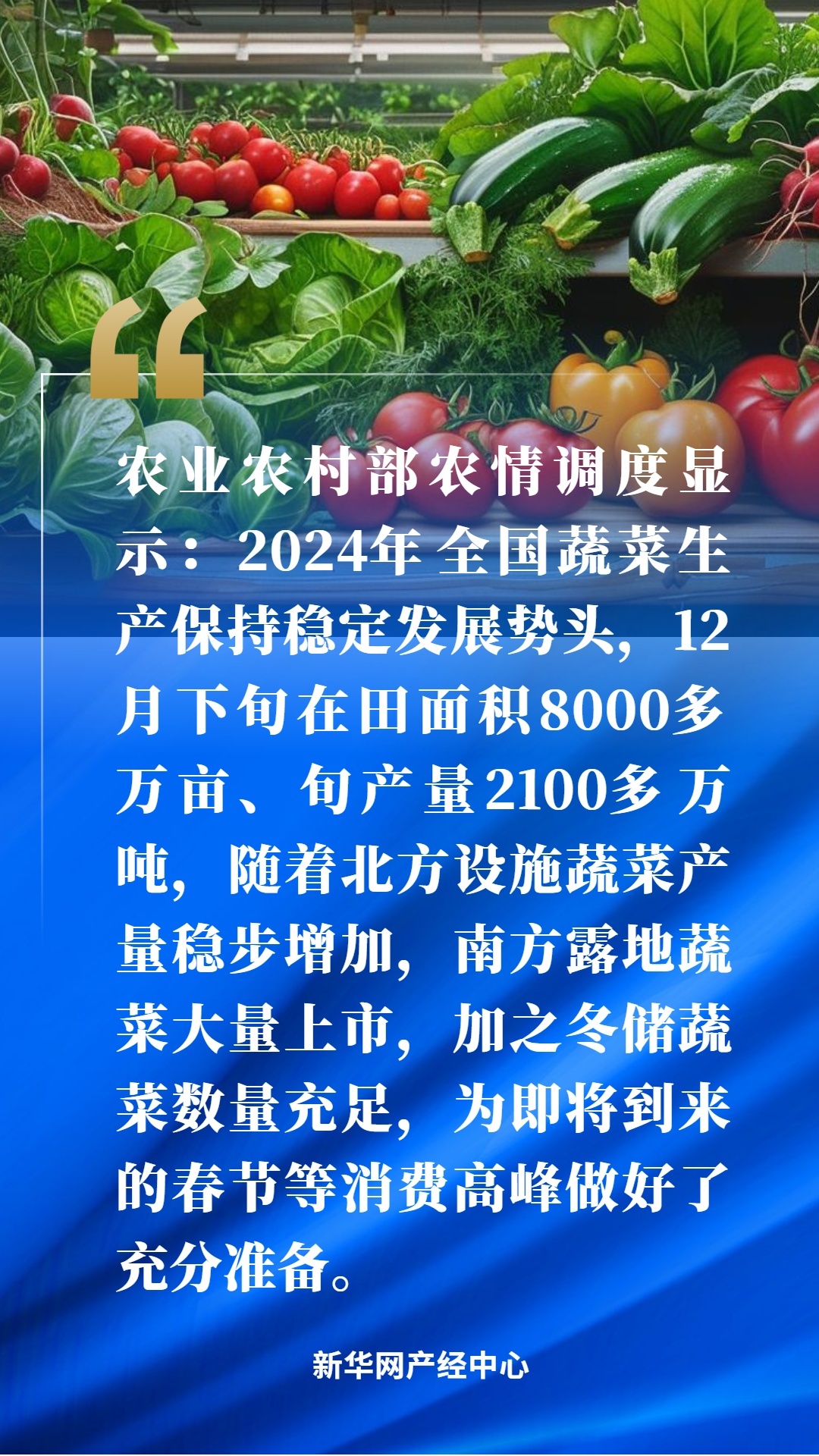 在保障國家“菜籃子”方面,我國各地嚴格落實“菜籃子”市長負責制,通過多項舉措確保農產品生產供應充足,市場價格平穩運行。根據農業農村部農情調度顯示,2024年全國蔬菜生產保持穩定發展勢頭,12月下旬在田面積8000多萬畝、旬產量2100多萬噸,隨著北方設施蔬菜產量穩步增加,南方露地蔬菜大量上市,加之冬儲蔬菜數量充足,為即將到來的春節等消費高峰做好了充分準備。