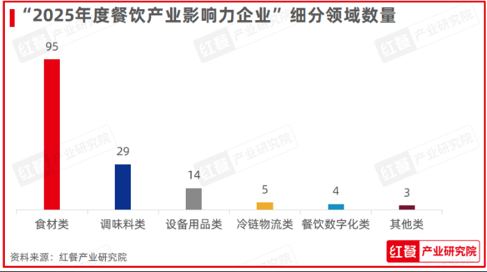 從“2025年度餐飲產業影響力企業”上榜企業的類別來看,基本涵蓋了餐飲上中游的各個領域,食材類、餐飲調味料類、設備及用品類、冷鏈物流類、餐飲數字化類、其他類的六個細分領域均有企業上榜。