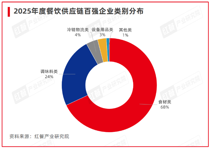 從“2025年度餐飲供應鏈百強企業”榜單的企業類別分布來看,食材類企業依舊占據主導地位,占比達到68%,較去年有所上升,充分彰顯了食材在餐飲行業根基性的重要地位;調味料類企業緊隨其后,占比為24%,展現出該賽道的強勁發展勢頭;設備用品和冷鏈物流企業占比相對穩定,分別為3%和4%;此外,還有其他類的占比為1%。