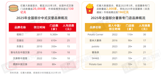 值得關注的是,在新中式風潮的推動下,西式快餐賽道也涌現了一批融合了中華美食文化的中式漢堡品牌,并逐漸形成了中式漢堡這個更細分的賽道。紅餐大數據顯示,截至2025年3月,全國中式漢堡門店數超2萬家,市場規模超過130億元,頭部品牌塔斯汀已在全國開出了9,000余家門店。