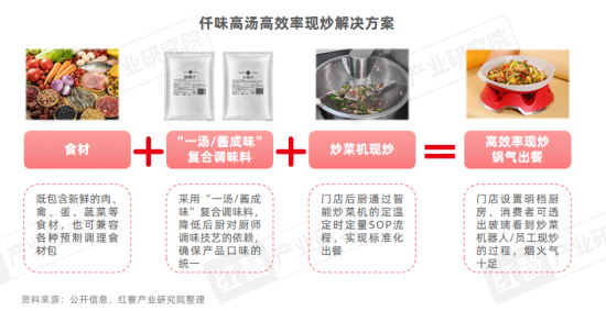 在餐飲上游,供應鏈企業也在積極推動現炒快餐的標準化和高效化。例如,中式復合調味料企業仟味高湯推出了“食材+一湯/醬成味+定溫定時定量SOP流程+炒菜機鍋氣現炒”高效率現炒解決方案,這一解決方案通過將新鮮/預制食材與標準化調味料相結合,配合精準的烹飪流程和智能炒菜設備,不僅大幅提升了出餐效率,還保證了菜品的穩定性和鍋氣十足的現炒口感。