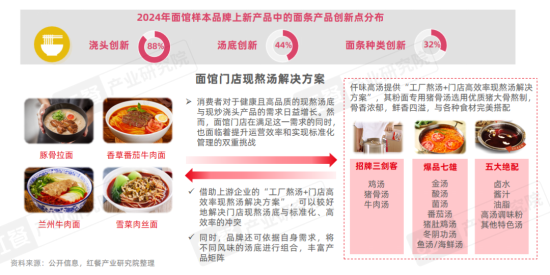 此外,隨著面館賽道入局者的不斷增多,為了保持市場競爭力,眾多面館品牌正積極地對面條產品進行創新和升級。據紅餐產業研究院不完全統計,2024年,監測面館樣本品牌推出了百余款面條新品,其中,澆頭創新占比高達88%,湯底創新占比達44%,湯底創新正從產品的配角躍升為差異化的核心要素。