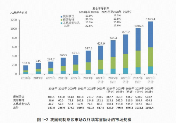 近年來,現制茶飲消費規模持續快速上升。以滬上阿姨為例,根據CIC灼識市場地位認證,截止至2024年12月31日,滬上阿姨10年已服務超20億人次?!栋灼凤@示:2023年現制茶飲占現制飲品市場規模的約50%,由2018年的1085億元增加至2023年的2585億元(人民幣),預計到2028年將按照17.3%的復合年增長率進一步增加至5732億元。據測算2024年全國茶飲門店總數超過66萬家,國民人均現制茶飲的年消費量預計從2023年的約11杯提升至2028年的約26杯,成為日常消費中重要的構成元素。