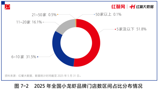 總體來看,小龍蝦餐飲品牌的規?;潭炔桓?。據紅餐大數據,截至2025年5月,全國超八成的小龍蝦品牌門店數規模在10家及以下。