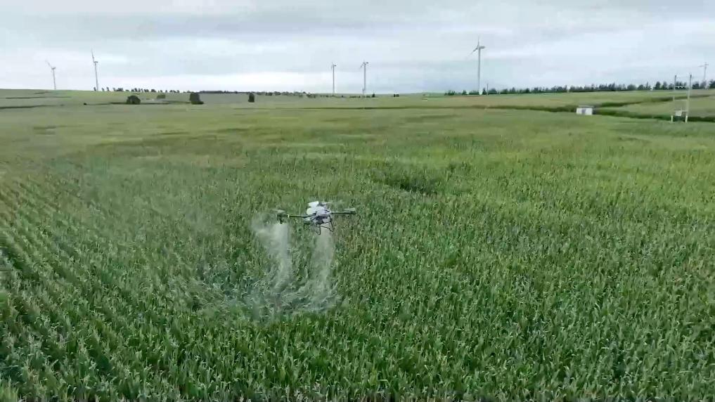 當前,正值玉米灌漿期。在內蒙古科爾沁右翼前旗察爾森鎮水泉嘎查萬畝高標準農田上空,裝載農藥的無人機正在沿著預設航線噴灑農藥。