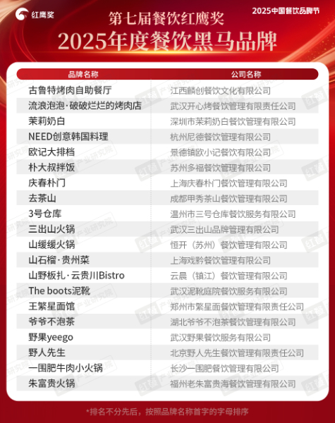 當日,作為“第七屆餐飲紅鷹獎”重要獎項的“2025年度餐飲黑馬品牌”揭曉。本年度共有20個表現突出的黑馬餐飲品牌上榜。