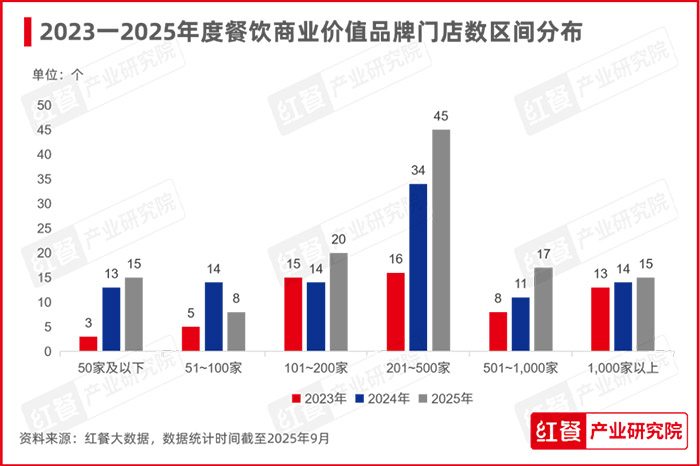 從門店規模上看,門店數在201~500家區間的上榜品牌數量依舊占據主導地位,占比接近四成。這一區間匯聚了眾多在市場中表現活躍且極具發展潛力的品牌,比如詹記桃酥、徐升記不改良老火鍋、蛙小俠等;101~200家區間品牌增至21個,含周麻婆、譚仔米線、師烤·豆花烤魚等;50家及以下品牌如湘之荷、羅二火鍋等,靠差異化定位立足;500家以上品牌如書亦燒仙草、熊大爺現包餃子等,憑規模效應占重要地位。