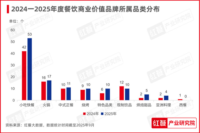 其中,作為核心獎項之一的“2025年度餐飲商業價值品牌” 進一步擴容,上榜品牌數量從上年度的100個增至120個。
