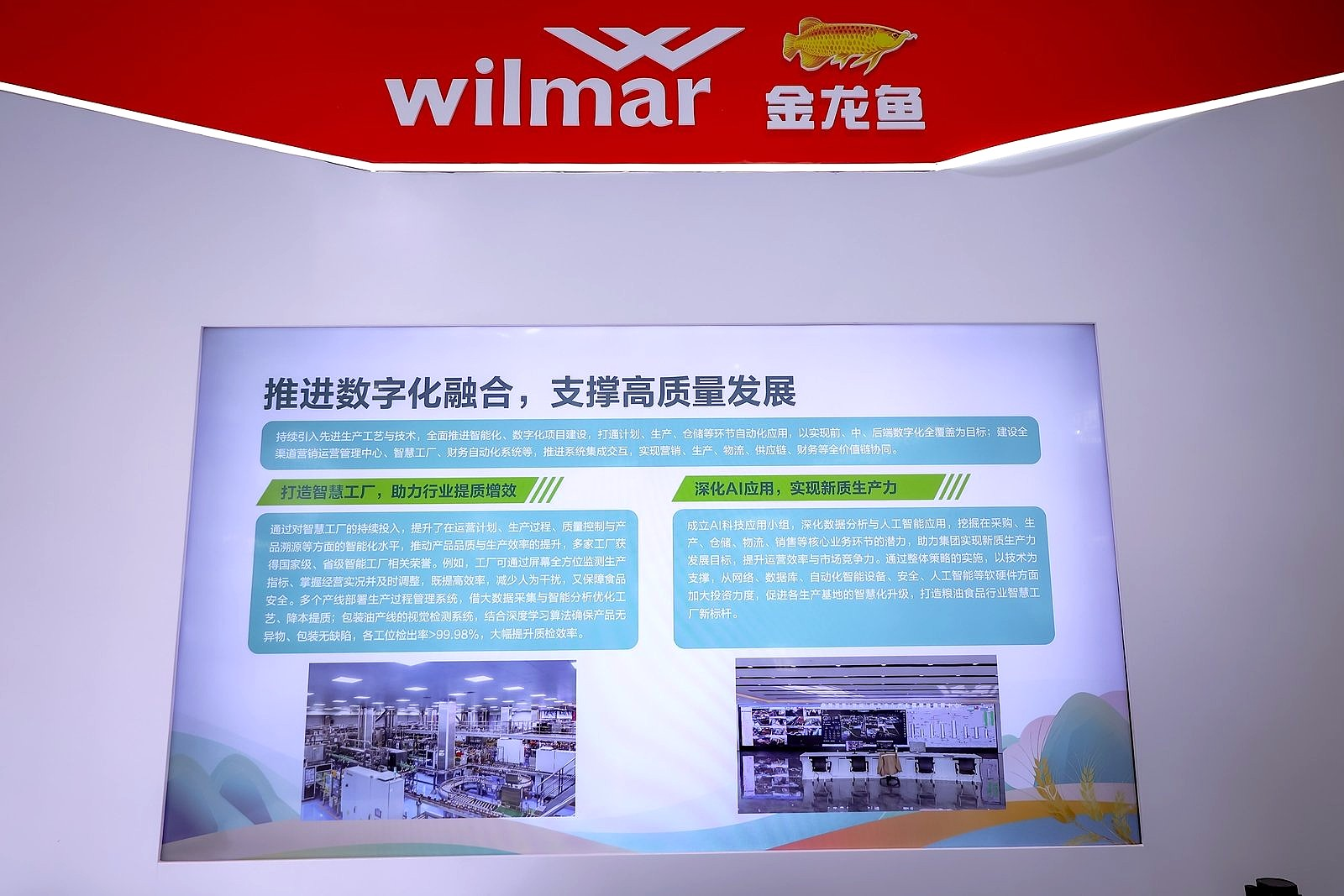 從展臺現場展示的內容來看,智慧工廠的運行實況令人眼前一亮:工廠數據中心的大屏幕上,各類數據實時顯示、一目了然。工作人員坐在屏幕前,只需輕點鼠標,就能對工廠實現全方位監測,不僅提高了生產效率,還減少了人為干擾,更能保障食品安全。目前,益海嘉里金龍魚旗下的工廠均已實現自動化,多家工廠榮獲國家級和省級智能工廠稱號,從原料到成品加工的每個環節都精準把控,優化工藝細節,提升資源利用率。