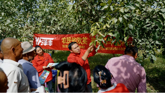 夏末初秋,在新疆巴楚縣的果園里,沉甸甸的蘋果掛滿枝頭。新洋豐南疆分公司巴楚和田小組業務員開賽爾江·艾斯開爾正為農戶提供施肥指導。2022年,這位新疆土生土長的小伙子,從華中農業大學碩士畢業后,選擇回到家鄉,扎根田野,用所學知識助力當地農業發展。