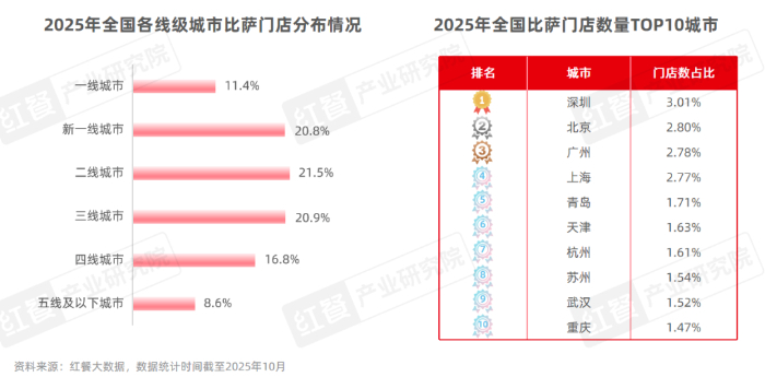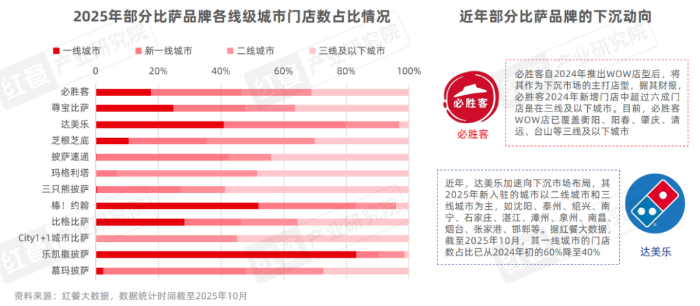 例如,必勝客2024年新增門店中超過六成是在三線及以下城市,截至2025年10月,必勝客在三線及以下城市的門店數占比已超過三成。達美樂2025年新入駐的城市以二線城市和三線城市為主,截至2025年10月,其一線城市的門店數占比已從2024年初的60%降至40%。此外,還有部分比薩品牌主攻下沉市場,如披薩速遞、三只熊披薩、City1+1城市比薩等。