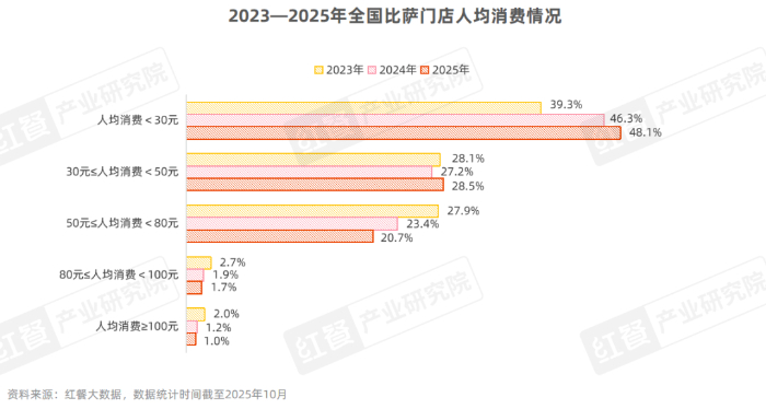 近年來,隨著性價比消費需求的持續攀升以及快餐類比薩門店的快速增長,比薩品類人均消費呈下滑態勢。紅餐大數據顯示,截至2025年10月,人均消費在30元以下的比薩門店占比達48.1%,居于首位;其次是30~50元區間,門店數占比為28.5%;人均消費在50~80元區間的門店數占比也超過了20%;80元及以上的比薩門店占比則較少。