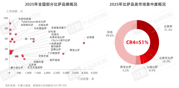 與此同時,比薩品類的高連鎖化也推動著比薩市場集中度的提升?;诟髌放频呢攬髷祿约肮_信息披露,紅餐產業研究院測算,2025年必勝客、達美樂比薩、比格比薩和尊寶比薩四大品牌將有望合計占據51%的市場份額。
