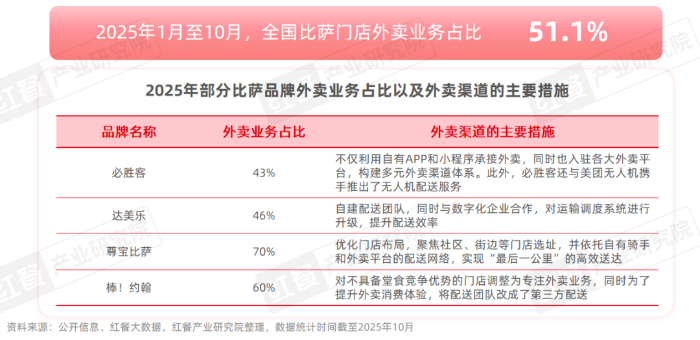 近年來,外賣已成為比薩品類的主要銷售渠道之一,紅餐大數據顯示,2025年1月至10月,全國比薩門店外賣業務占比已達到51.1%,較2024年提升了1個百分點。眾多比薩品牌也愈發重視外賣業務的發展,例如,必勝客構建了多元外賣渠道體系,其不僅依托自有APP和小程序承接外賣,同時也入駐各大外賣平臺,根據其財報,必勝客2025年第二季度外賣銷售額同比增長15%,外賣業務占比達到43%,較2024年同期提升了5個百分點;達美樂、尊寶比薩等品牌則主攻外賣業務,其中達美樂在一線城市的外賣業務占比超過七成。