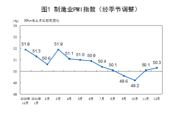 國家統計局服務業調查中心和中國物流與采購聯合會12月31日聯合發布數據顯示,12月份,中國制造業采購經理指數(PMI)為50.3%,比上月上升0.2個百分點,高于50%的臨界點。這一先行指標連續兩個月回升,顯示出經濟運行和市場預期的積極變化。
