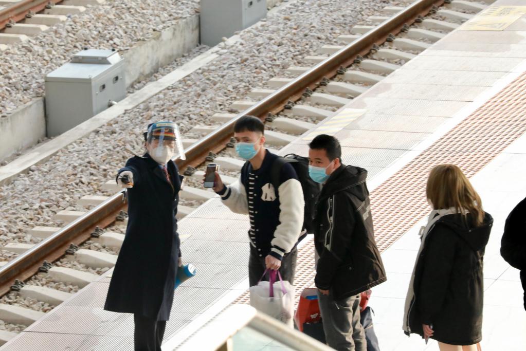 “體溫正?!壁M州西站旅客依次穿過溫度檢測門,報警器里不斷發出的提示音,讓人安心。