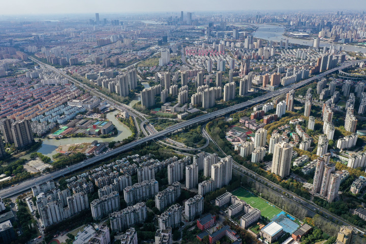 圖為2020年11月12日拍攝的上海龍陽路立交橋附近的商品房(無人機照片)。新華社記者 丁汀 攝