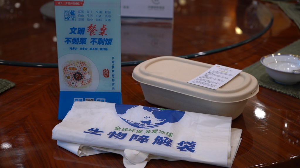圖為重慶華辰國際大酒店采用的可降解環保打包材料與“光盤行動”標識。 新華社發(胡雨婷 攝)