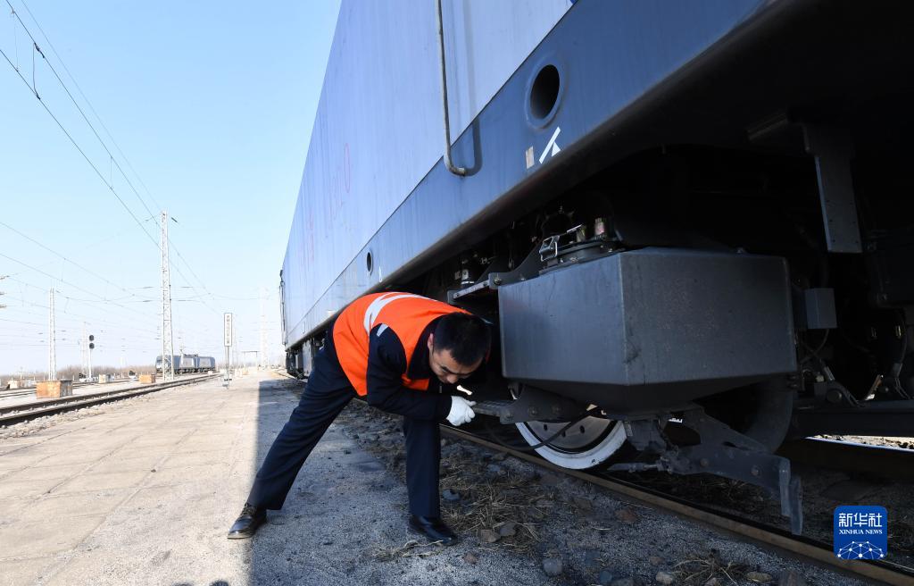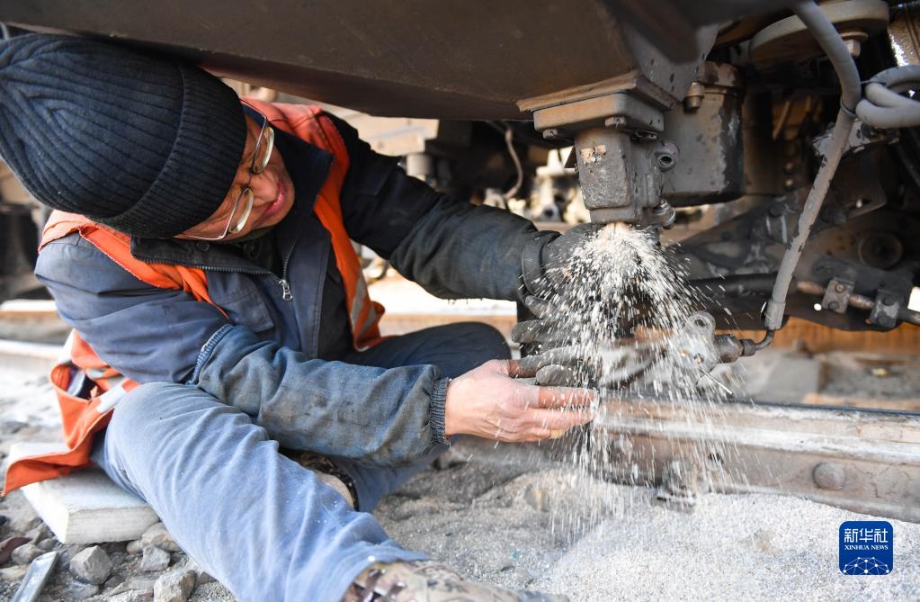 重載司機呼長寶在發車前檢查列車(1月20日攝)。新華社記者 柴婷 攝