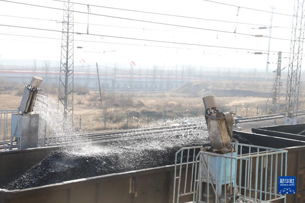 在塔山煤礦的裝車站,列車上的煤堆被噴灑抑塵劑(1月19日攝)。新華社記者 陳志豪 攝