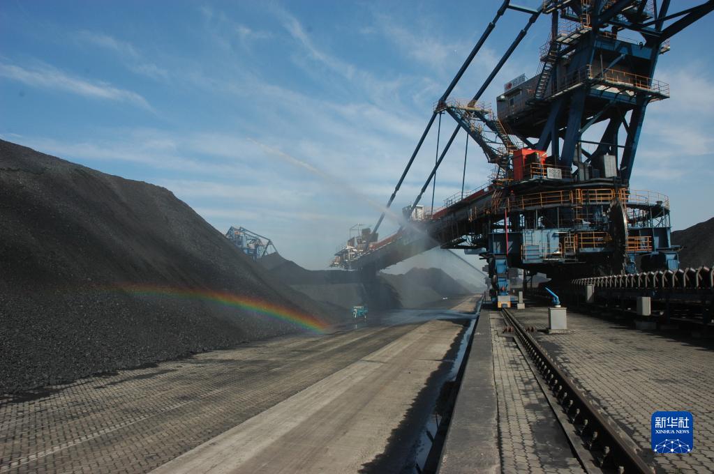 在河北省秦皇島柳村南站,裝船機在取料進行裝船作業(資料照片)。新華社發