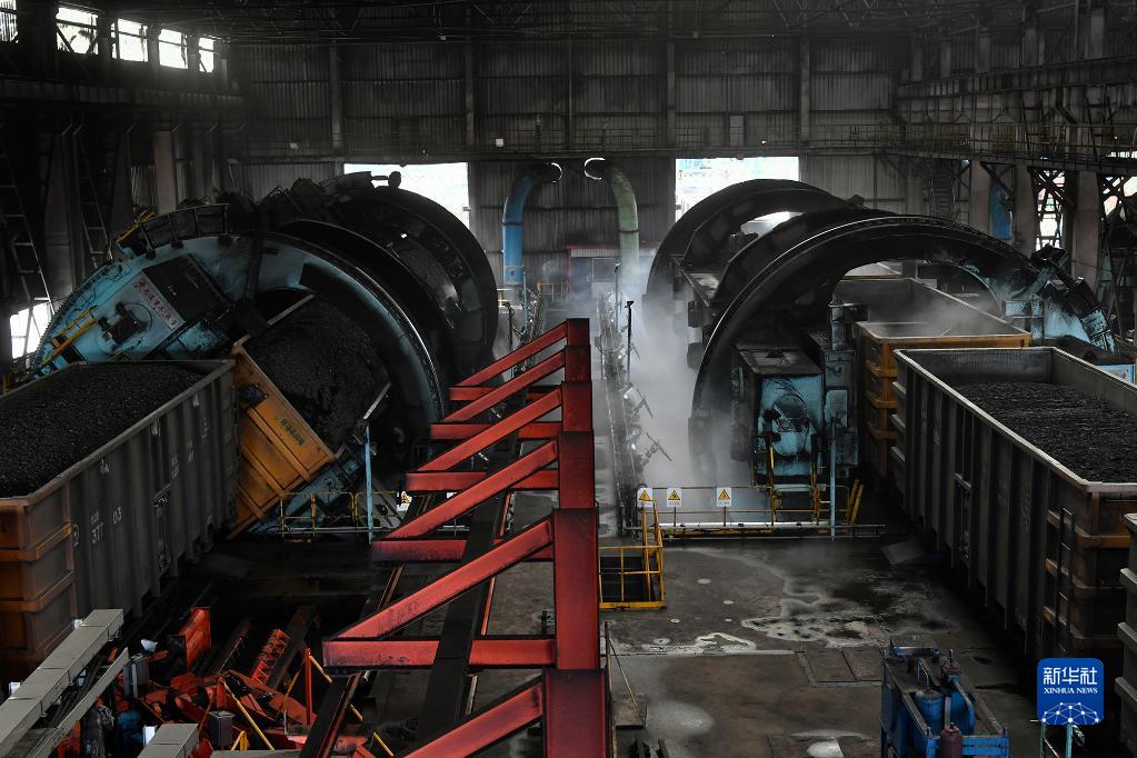 在河北省秦皇島柳村南站的翻車機房,翻煤機將車廂內滿載的煤炭倒進傳送帶(資料照片)。新華社發