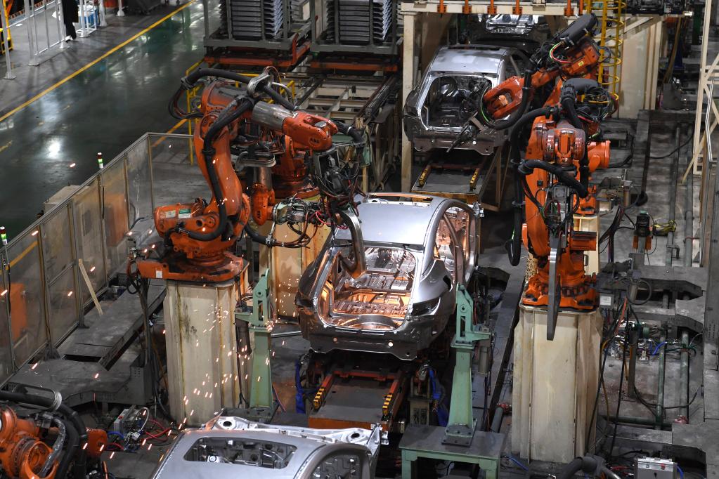 工業機器人在江淮汽車乘用車焊接車間生產線上工作(2022年2月22日攝)。新華社記者 劉軍喜 攝