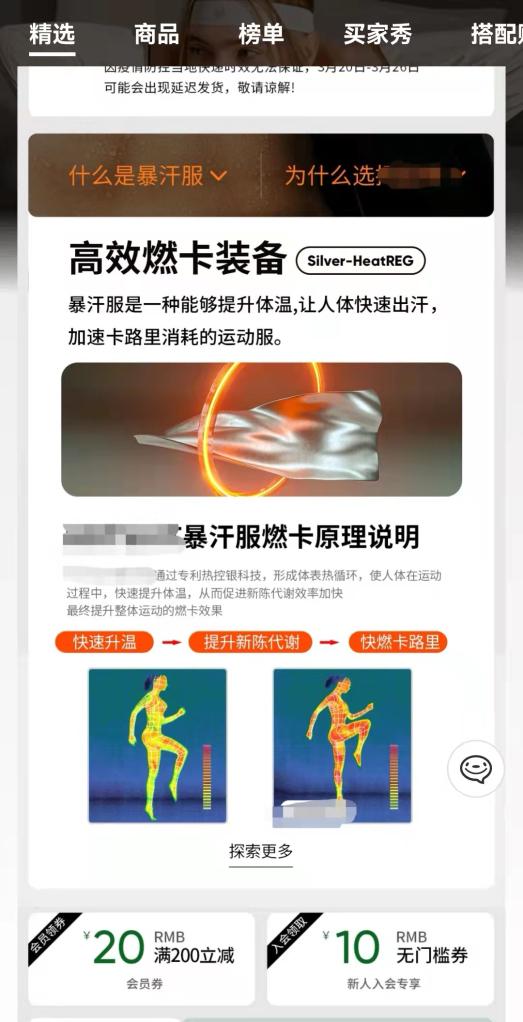 記者向一家熱門單品月銷超過6000件的某暴汗服網店咨詢該產品,商家解釋稱,“暴汗服采用熱控銀科技面料,可以在體表形成熱循環與熱反射,熱反射可多倍消耗熱量提升身體代謝效果,熱循環有效將身體毛孔打開激活汗腺,達到暴汗燃脂現象”,至于減肥效果,“客戶反饋一般月瘦2-20斤左右”。一位銷售主播還宣稱,“只要是易胖體質,沒時間運動的,都可以穿暴汗服,提高運動效率和效果”。