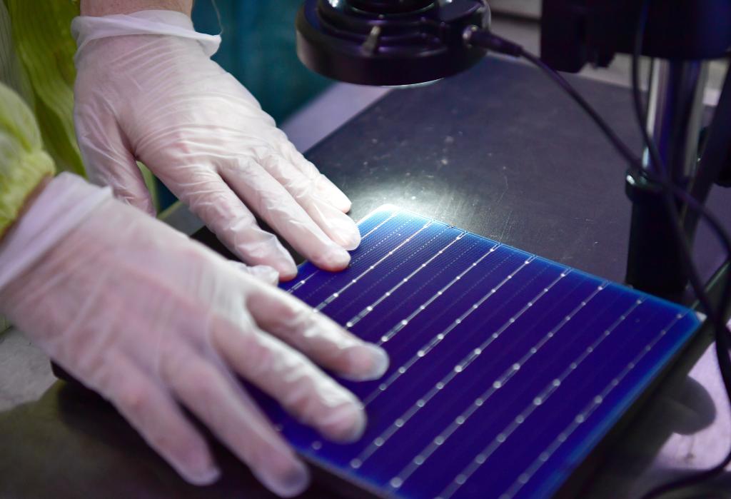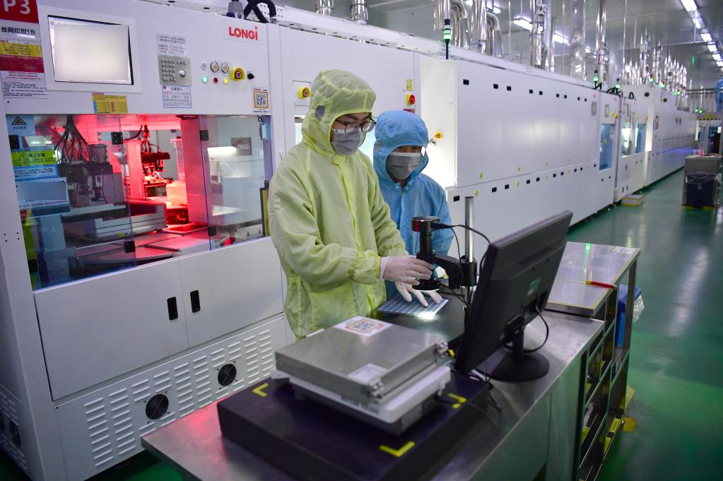 3月25日,工作人員在隆基單晶硅太陽能電池工廠內檢查電池片。新華社記者邵瑞 攝