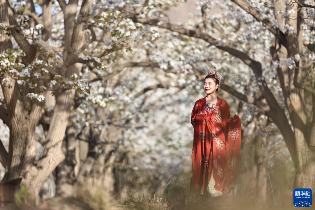 4月7日,景區工作人員在甘肅省蘭州市皋蘭縣什川鎮百年梨園內進行表演。受疫情影響,景區組織工作人員在梨園內直播,邀請人們“云賞花”,滿足公眾賞花需求。新華社記者 陳斌 攝