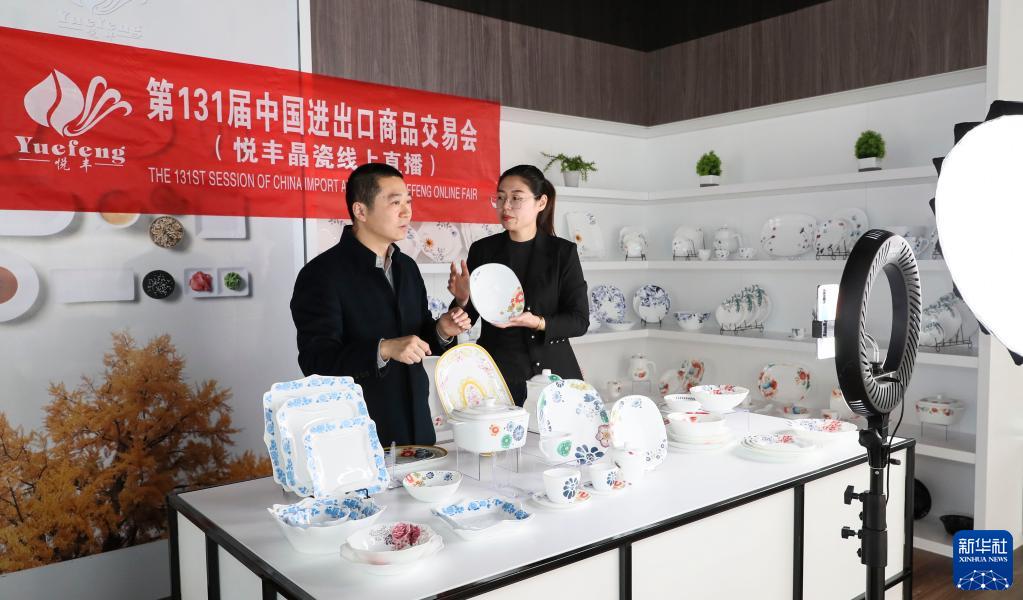 4月15日,第131屆中國進出口商品交易會線上開幕。在江蘇省淮安市洪澤區,一家陶瓷企業的工作人員在展廳直播介紹產品。新華社發(趙啟瑞 攝)